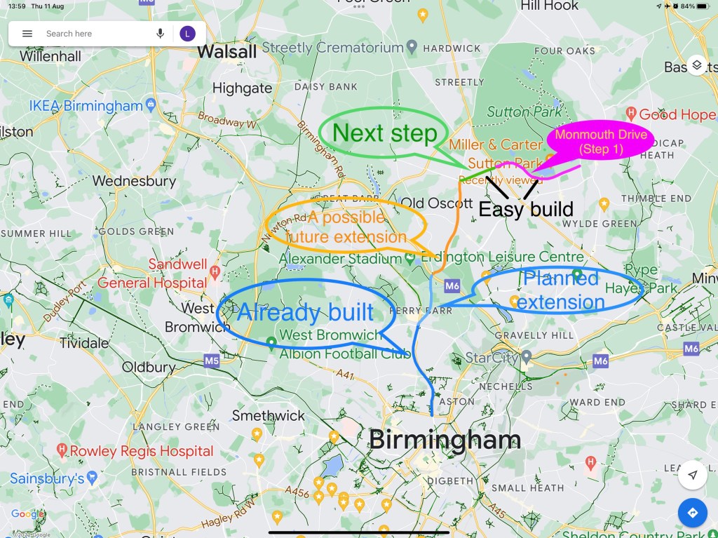 More ambitiously, many years in the future an elevated CSH could even run alongside the railway line leading to Sutton train station and possibly Wylde Green train station (light blue vertical line – right).